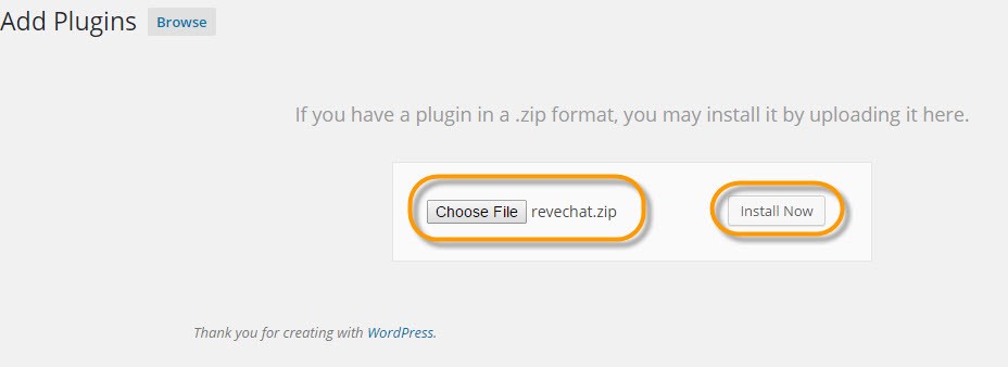 Next, click on the ‘Choose File’ option and select the WordPress plugin file which you have downloaded from your REVE Chat dashboard. Once the file gets uploaded, click on ‘Install Now’.