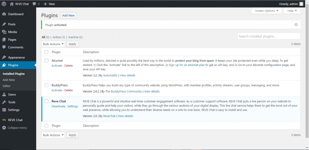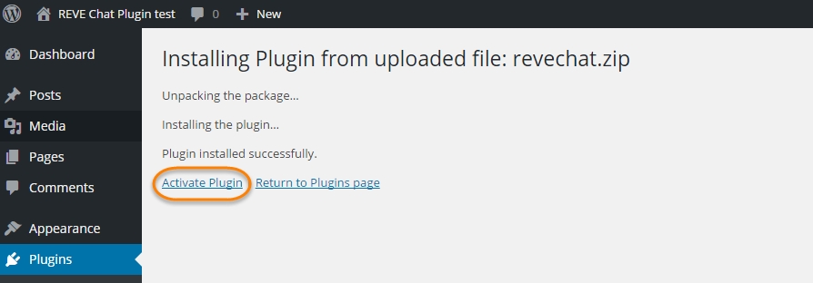 Once the installation process is over, activate the REVE Chat Plugin by clicking on the ‘Activate Plugin’ button.