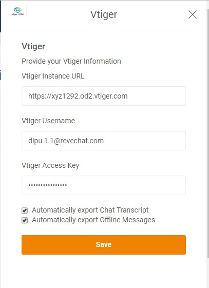 A form will be opened to submit your vtiger account credentials to integrate with REVE Chat. Fill up the form with your vtiger instance url, username and access key and check the ticket setup in which way you want to save your transcript.
