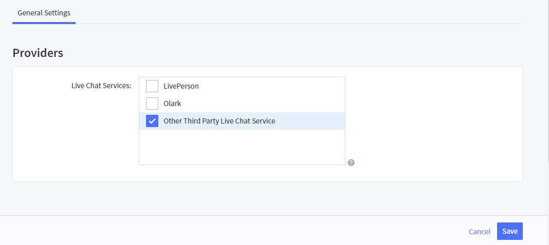 From general settings Check the box next to Other Third Party Live Chat Service from available options, then click Save.
