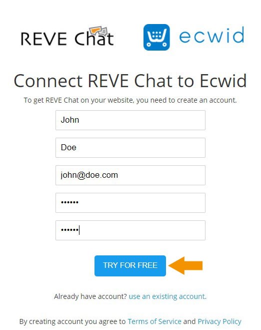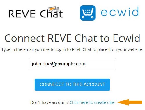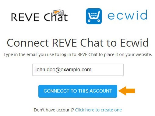 Next, you need to connect a REVE Chat account with your Ecwid store. If you already have REVE Chat account then provide your REVE Chat login email address and click CONNECT TO THIS ACCOUNT.