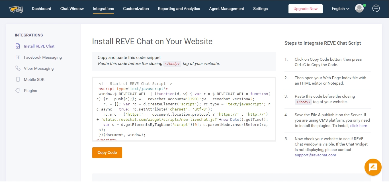 In the editor panel, just before the closing </body> tag paste REVE Chat code that you have copied earlier.