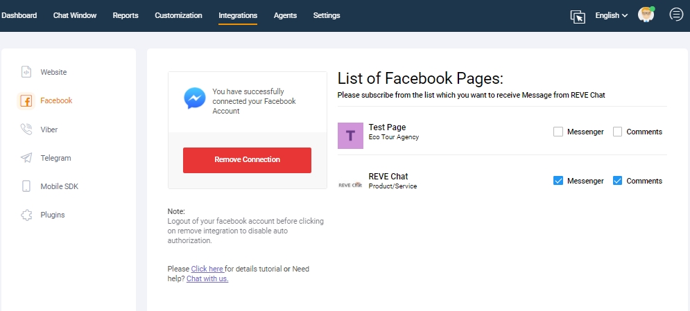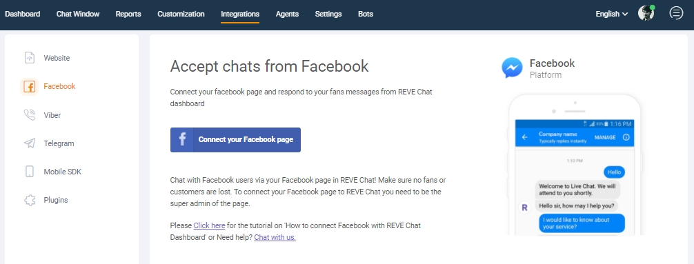 Click on connect your Facebook page and respond to the messages from the REVE Chat dashboard.